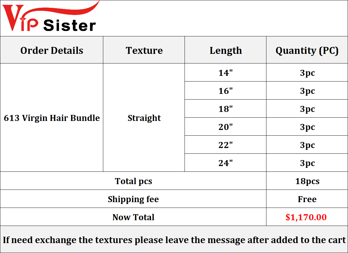 Vipsister 18 pcs indian 613 virgin hair bundles total 1170$ free shipping